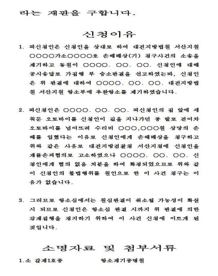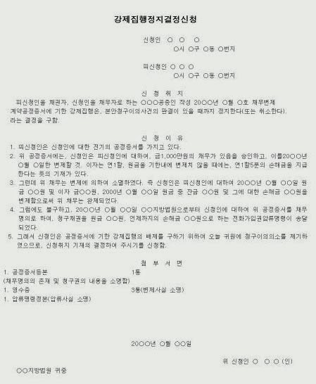 집행정지사유는 크게 1) 법원사실의 발생, 2) 법원서류의 제출로 구분할 수 있다(민사집행법 제49조). 1) 법원 사실관계 발견 시 직권으로 집행정지사유가 있는 경우(집행무효 등본, 채무자의 파산선고, 회생절차개시 등) 집행불가판결 등본, 집행정지명령 , 형집행의 취소명령② 집행정지를 명한 원심판결 ☞ 상고심결 전 집행정지명령(민사소송법 제448조), 재심 및 상소기간중의 시정신청 , 집행정지명령 상소후 집행유예(민사소송법 제448조, 제500조, 제501조), 압류금지결정에 대한 재판에 부수하는 가처분으로서 집행의 일시정지 여기에는 발부된 명령(민사집행법 제34조 제2호, 제16조 제2호, 제15조 제6항, 제46조 제2항, 제47조 제1항, 제48조 제3항, 제196조 제3항 3개 항목). ③ 집행을 면할 담보를 제공한 증빙서류 ④ 채권자가 판결집행 후 변제를 받았거나 채무이행을 유예하기로 합의하였음을 나타내는 서류 계약서 또는 공증인이 인증한 계약서, 법집행기관이 실제 계약으로 인식할 수 있습니다. 참고로 환급 요청은 여기 파일에 적용되지 않습니다. 채무자가 위의 변제 등의 사실에도 불구하고 증빙서류가 없거나 즉시 채무를 인상할 수 없는 경우 채무자는 채무자의 존재를 이유로 이의를 제기하고 집행을 정지한다(제2⑤호). ☞ 가집행판결 항소법원의 본안에 따라 재판과정에서 청구권이 취소되거나 ⑥ 불집행, 위탁취소의 의사표시가 있는 화해조서 또는 공증서 원본 화해계약서(화해조서) 또는 공증서에 인가취소 동의서가 포함되어 있지 않음서면