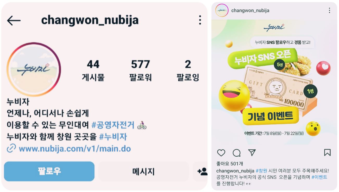 참여기간 : 2024년 7월 8일(월) ~ 7월 22일(화) 참여방법 – 인스타그램 계정(@changwon_nubija) 팔로우 – Nubija 계정 게시물에 좋아요를 누르고 오픈을 축하하는 댓글을 남겨주세요! * 친구를 태그하면 당첨 확률이 높아집니다! 당첨자 발표 : 7월 25일(목) 인스타그램 당첨자 발표, 개별 DM 발송 경품 – 카카오톡 기프트 모바일 상품권 10만원권(1명) – BBQ 골든올리브 치킨 상품권(5명) #창원 #창원시 #창원스페셜시티 #누비자 #누비자SNS #창원시SNS #누비자인스타 #누비자이벤트 #창원시이벤트 #누비자오픈이벤트