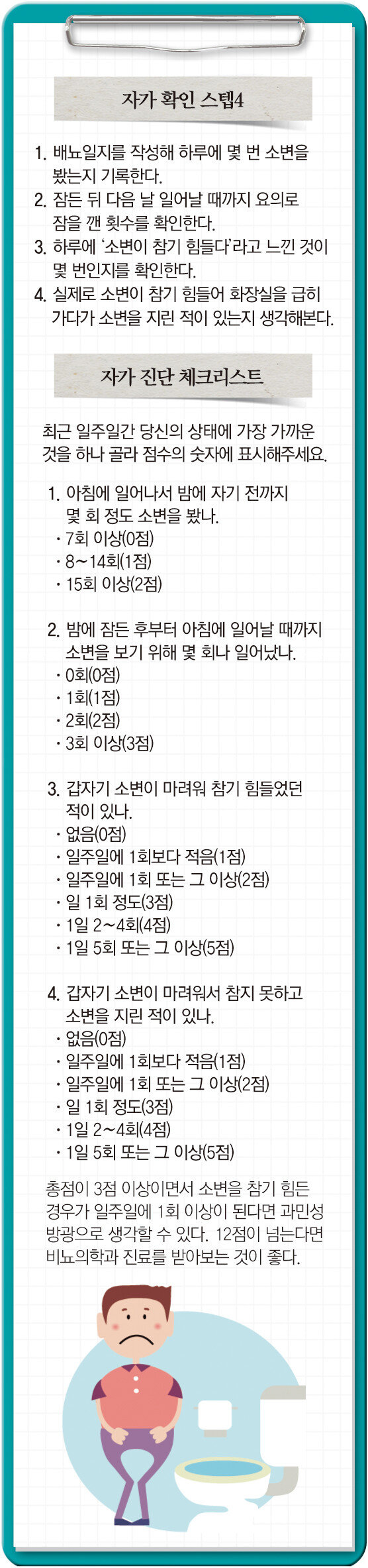 1~2시간마다 화장실을 가고, 하루에 8번 이상 화장실을 가고, 밤에 소변이 마려워서 2번 이상 깨고, 빈뇨로 인한 수분 섭취량 감소, 소변 참기 어려움, 화장실 가기 전에 소변을 본다 둘 다 있다면 주변에 화장실이 없을 때의 불안, 성교시 배뇨 곤란 등 두 가지 이상의 증상이 나타나면 과민성방광을 의심해볼 수 있습니다. 또한 과민성 방광은 많은 여성, 특히 젊은 여성에게 특별한 문제로 특별한 이유 없이 발생하는 경우가 많으며 물론 심리적인 요인도 한 몫을 하지만 감각을 감지하는 방광 내 감각신경이 자극을 받거나 예민해져 그 원인은 정상보다 더 민감하며, 그 외에도 뇌졸중, 파킨슨병, 알츠하이머병, 뇌종양이나 기타 신경계 질환이나 척수손상, 남성의 경우 전립선비대증, 여성의 복압성 요실금, 방광염, 질염, 방광결석, 또는 이뇨제를 복용할 때. 저 할 수 있어요.