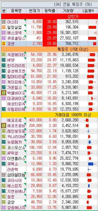 오늘 상한가를 기록한 종목은 아스타, 일일언럽, 에스코넥, 큐로홀딩스, 코센이다.