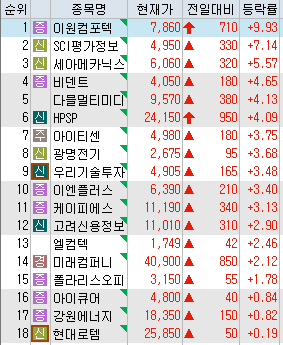 주가 15% 이상 증가 오늘 기능 참고숙경에이티, HPSP, 한주라이트, 윤성F&C, 탑머티리얼, 케이피에스, 가온칩스, 박셀바이오, 미코바이오메드, 해성티피씨, 우림PTS 등이 그 예다.