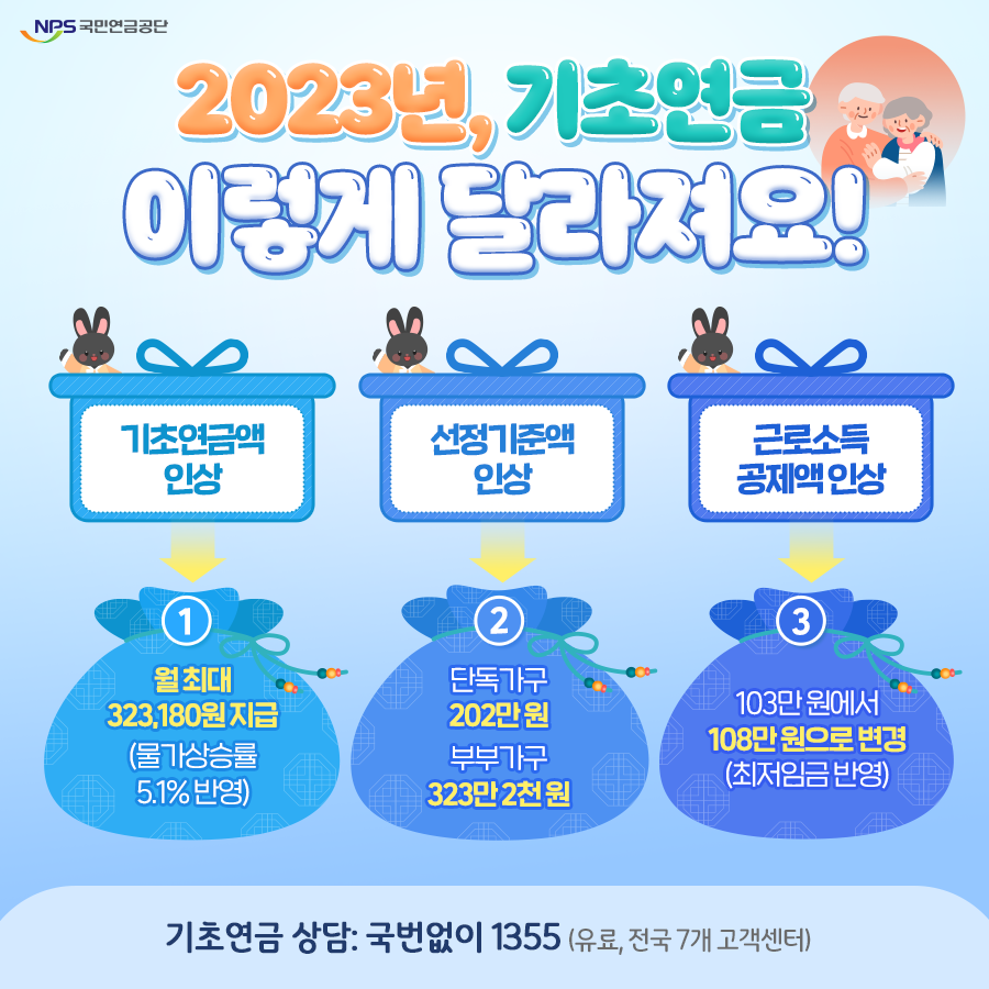 2023년 기초연금 선정기준은 1인 가구 202만원, 부부 323만2000원으로 변경된다. 2022년에는 1인 가구 180만원, 부부 288만원이었다.