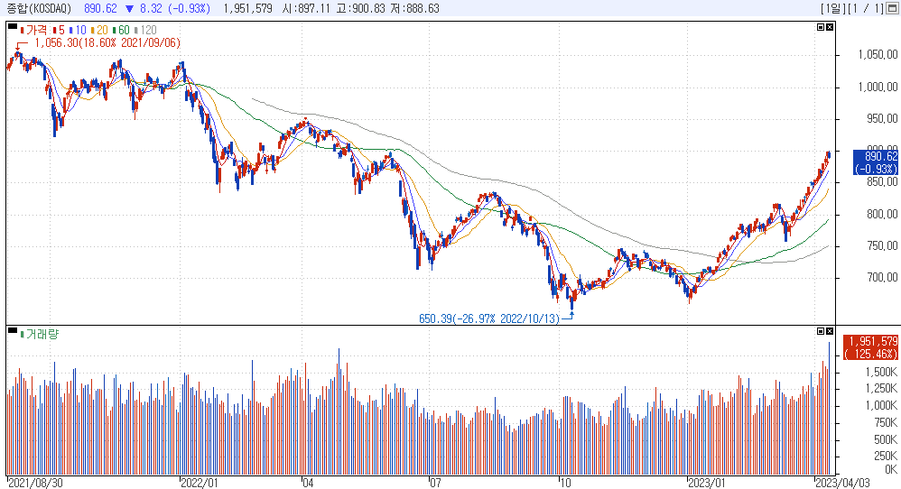 코스닥종합차트 (역시 조정이 나올 위치에서 나왔다! 잠시 머뭇거리다가 섹터 이동인가? 아니면 가격 조정의 시작인가? )