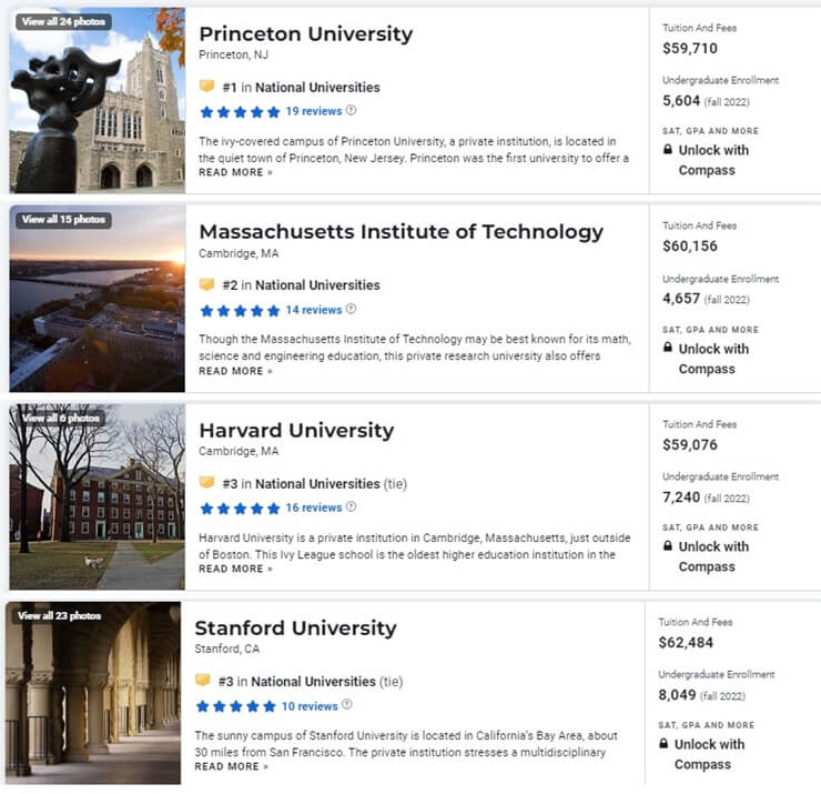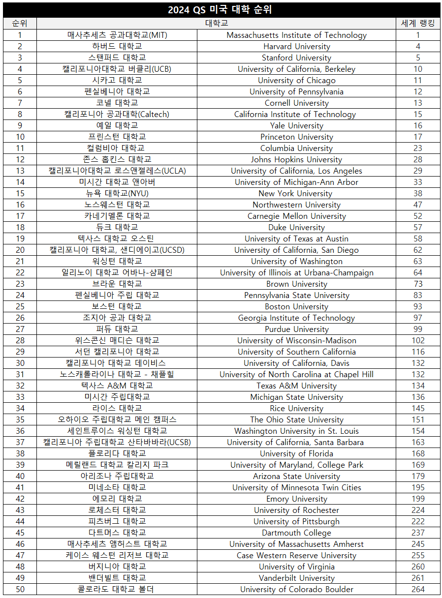 하지만 순위 자체는 수학공식처럼 절대적인 진실이나 사실이 아니라, 각 언론사가 정한 기준에 따라 계산된 것이기 때문에 이러한 순위를 단순히 참고용으로만 생각하시는 것이 여러모로 도움이 되지 않을까 싶습니다. 맹목적으로 그들을 신뢰합니다. 아래는 2024년 순위입니다. US News가 선정한 미국 상위 50개 대학을 살펴보겠습니다.