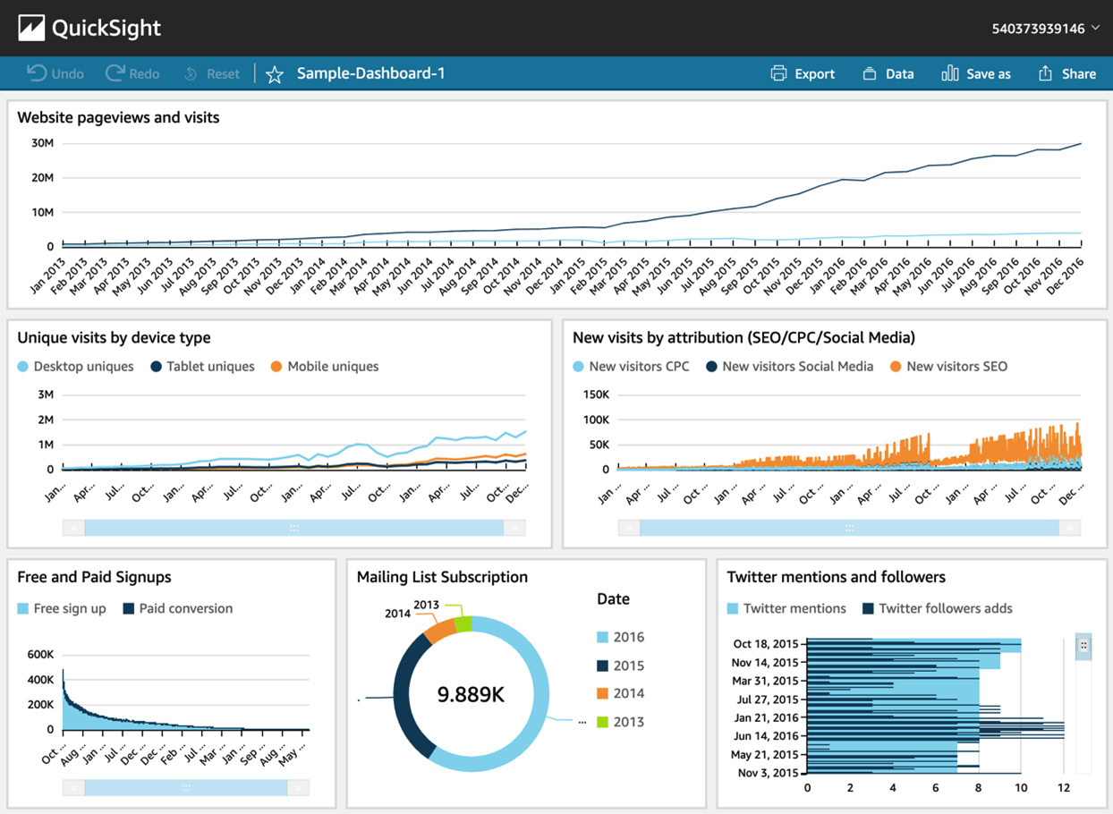 Amazon QuickSight는 비즈니스 사용자에게 데이터에 대한 액세스를 제공합니다. 대화형 액세스, 다양한 유형과 스타일을 지원합니다. 대시보드는 여러 데이터 소스의 데이터를 표시할 수 있으며 사용자는 데이터를 필터링 및 정렬하고 데이터 세트의 특정 측면으로 드릴다운할 수도 있습니다.