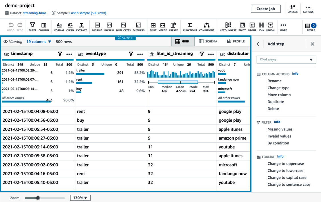 AWS Glue DataBrew 시각적 변환 디자이너